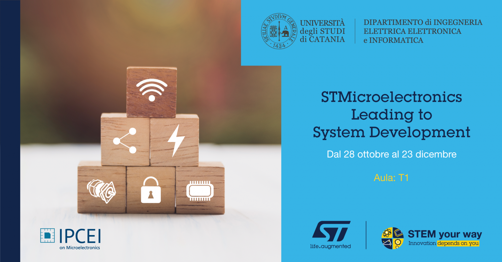 - “STMicroelectronics Leading to System Development” organized by STMicroelectronics, responsible for the course dr. Maria Celvisia Virzi (maria-celvisia.virzi@st.com). The lessons will be held on Thursday afternoon starting from 28th October, room T1.