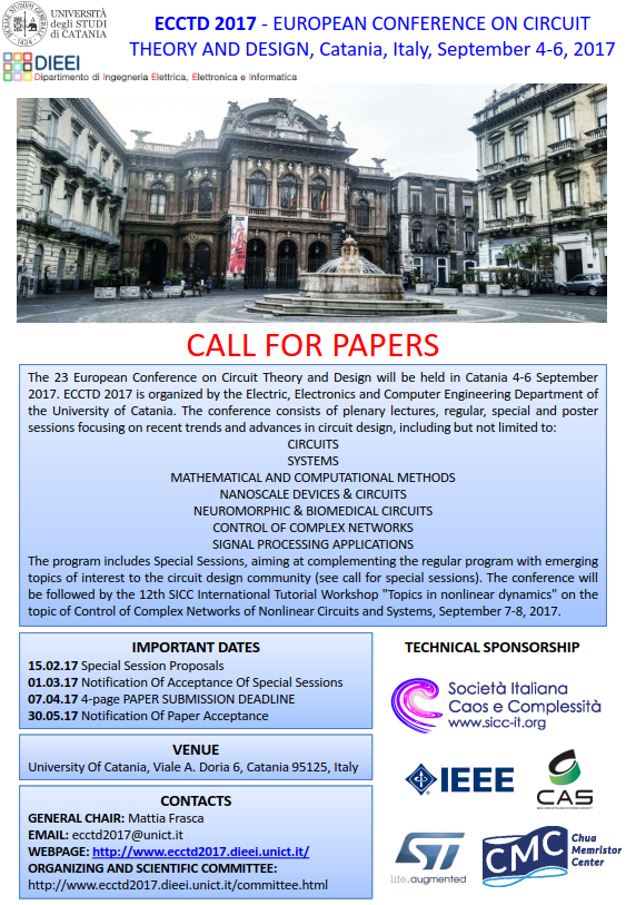 Il DIEEI organizza la 23ma edizione della conferenza ECCTD (European Conference on Circuit Theory and Design), che si terrà a Catania presso la Cittadella Universitaria dal 4 al 6 Settembre 2017.