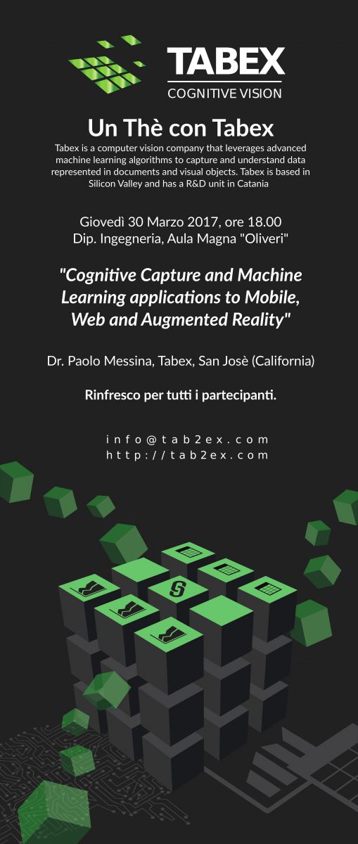 Giovedì 30 Marzo 2017, alle ore 18.00, presso l'Aula Magna Oliveri, il Dr. Paolo Messina di Tabex terrà un seminario su "Cognitive Capture and Machine Learning applications to Mobile, Web and Augmented Reality".